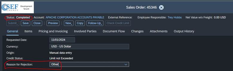 2. Once the invoice is cancelled you can then modify the Sales Order. If you messed up on the requested dates or other dates you will need to reject those lines and add them back with the correct date. If you are cancelling the whole sales order you will also reject the lines by entering a reason for rejection