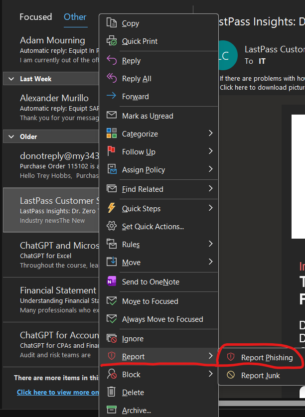 Find the suspicious email and right click it -> Hover over Report -> Report Phishing