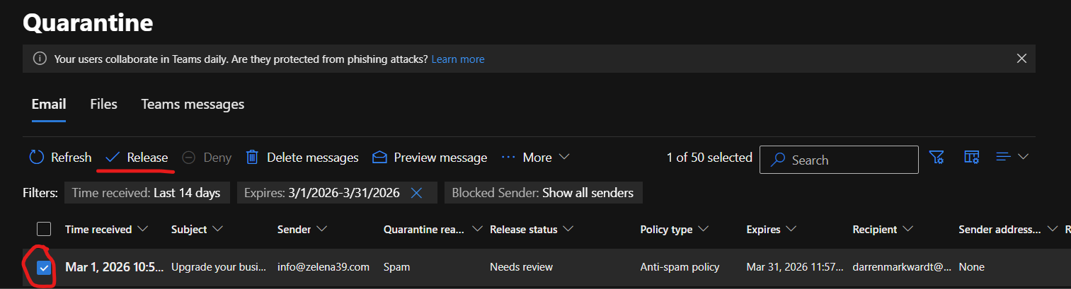 1. You will go to the Quarantine email page here - https://security.microsoft.com/quarantine