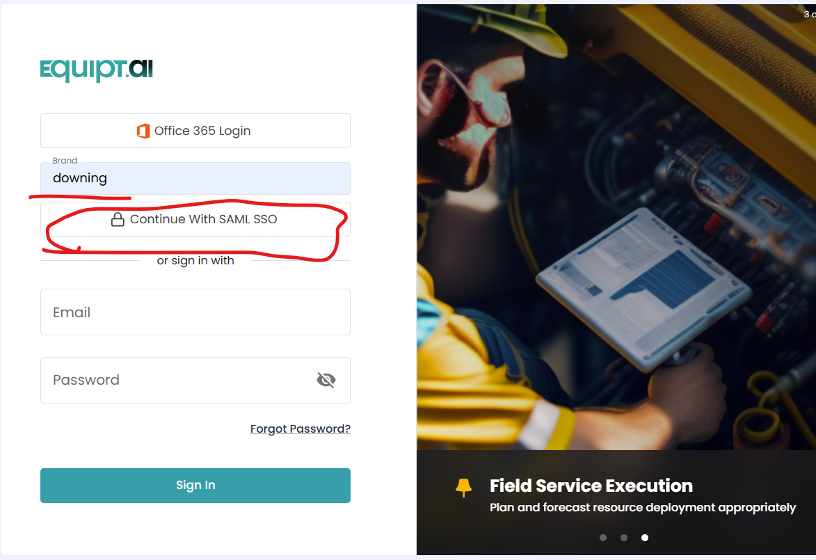 Go to https://portal.equipt.ai/ and on that screen click Continue with SAML SSO and enter downing as the brand and click continue with SAML SSO again. You will then enter your Microsoft login information. Equipt will then email you a code to enter. After the code is entered you should be logged in.